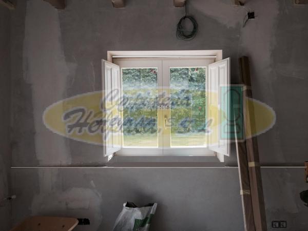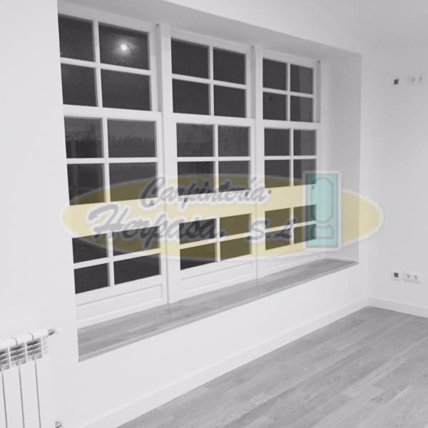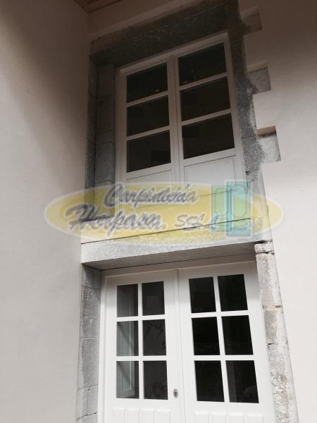 Trabajo de carpintería que ha incluido puertas y ventanas lacadas en blanco con aperutas en guillotina y oscilobatienes. Las puertas y ventanas incluyen contraventanas castellanas a juego y algunos cerramientos se han fabricado en un estilo ingles para dar al conjunto algo de variedad y estilo.